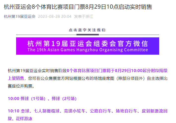 原標(biāo)題:杭州亞運會8個體育比賽項目門票8月29日10點啟動實時銷售