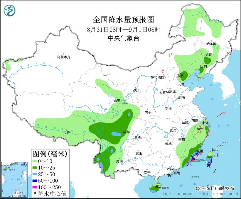 8月30日08時(shí)至31日08時(shí),黑龍江西北部、蘇皖南部、上海、浙江大部、福建北部、雷州半島、云南西部、海南島、臺(tái)灣島等地的部分地區(qū)有中到大雨,其中,云南西部、海南島西北部和東南部、臺(tái)灣島東南部等地局地有暴雨或大暴雨(100~240毫米)。內(nèi)蒙古中部和西部、遼東半島、山東半島、浙江東部沿海等地的部分地區(qū)有4~6級(jí)風(fēng)(見圖3)。