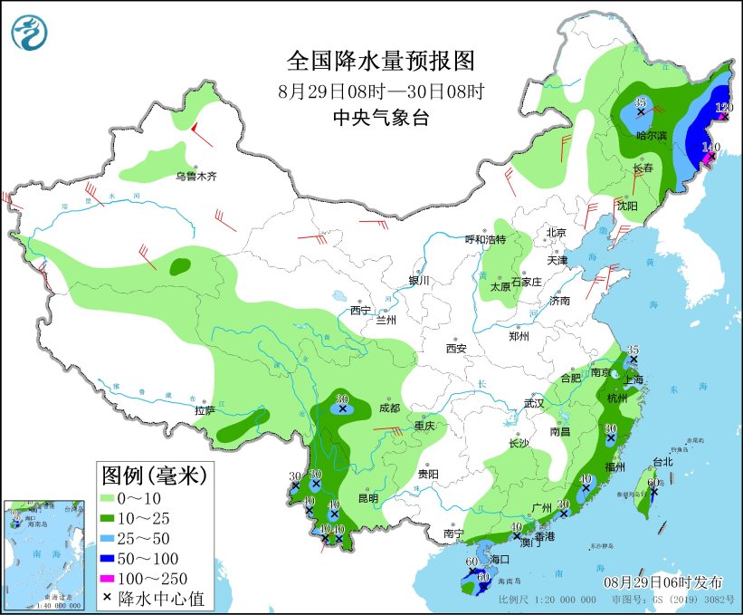 8月29日08時(shí)至30日08時(shí),黑龍江東部和西南部、吉林東北部、江蘇東南部、福建北部和東南部、廣東沿海、海南島大部、云南西部、川西高原中部、臺(tái)灣島東部等地部分地區(qū)有大到暴雨,其中,黑龍江東部、吉林東北部等地局地有大暴雨(100~140毫米)。內(nèi)蒙古中部和西北部、甘肅西部、黑龍江南部、遼寧、山東半島等地的部分地區(qū)有4~6級(jí)風(fēng),陣風(fēng)7~8級(jí)(見圖2)。