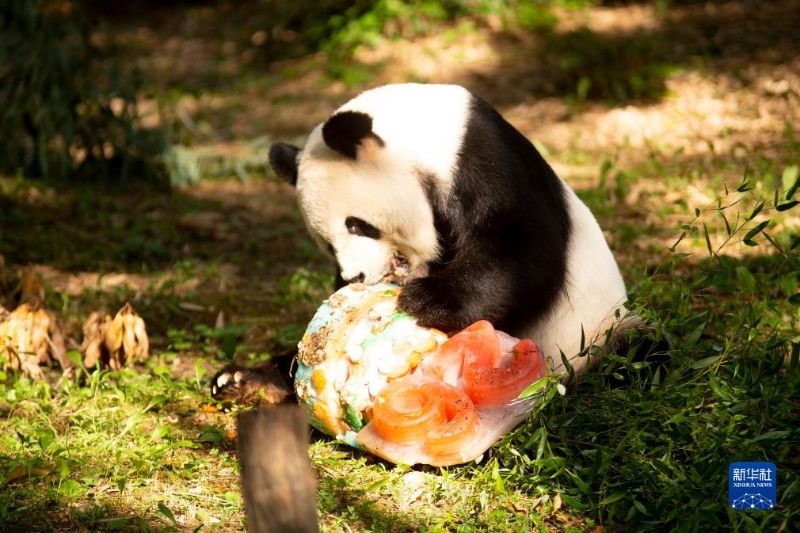 8月27日,大熊貓“添添”在美國首都華盛頓史密森學(xué)會(huì)國家動(dòng)物園享用生日蛋糕。