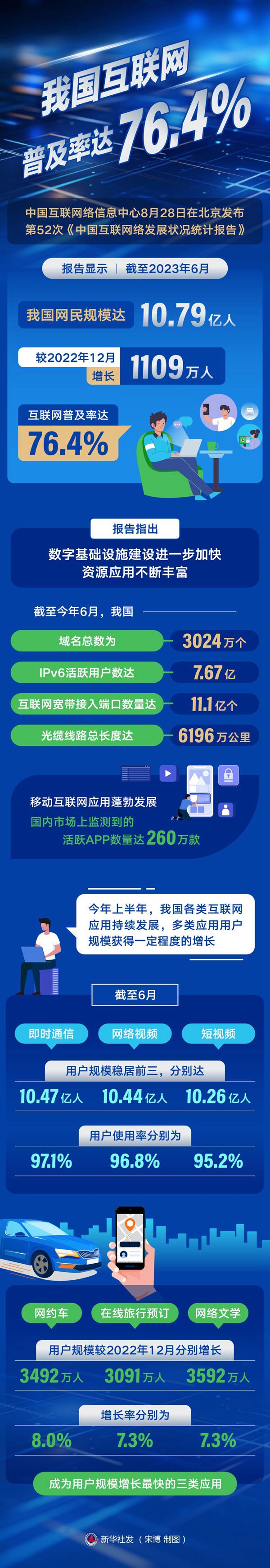 新華社北京8月28日電(記者王思北)中國(guó)互聯(lián)網(wǎng)絡(luò)信息中心28日在京發(fā)布第52次《中國(guó)互聯(lián)網(wǎng)絡(luò)發(fā)展?fàn)顩r統(tǒng)計(jì)報(bào)告》。報(bào)告顯示,截至2023年6月,我國(guó)網(wǎng)民規(guī)模達(dá)10.79億人,較2022年12月增長(zhǎng)1109萬人,互聯(lián)網(wǎng)普及率達(dá)76.4%。
