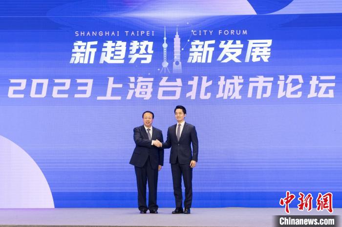 8月30日,上海市市長(zhǎng)龔正(左)與臺(tái)北市市長(zhǎng)蔣萬安(右)在2023上海臺(tái)北城市論壇上握手?!?上海市臺(tái)辦供圖)