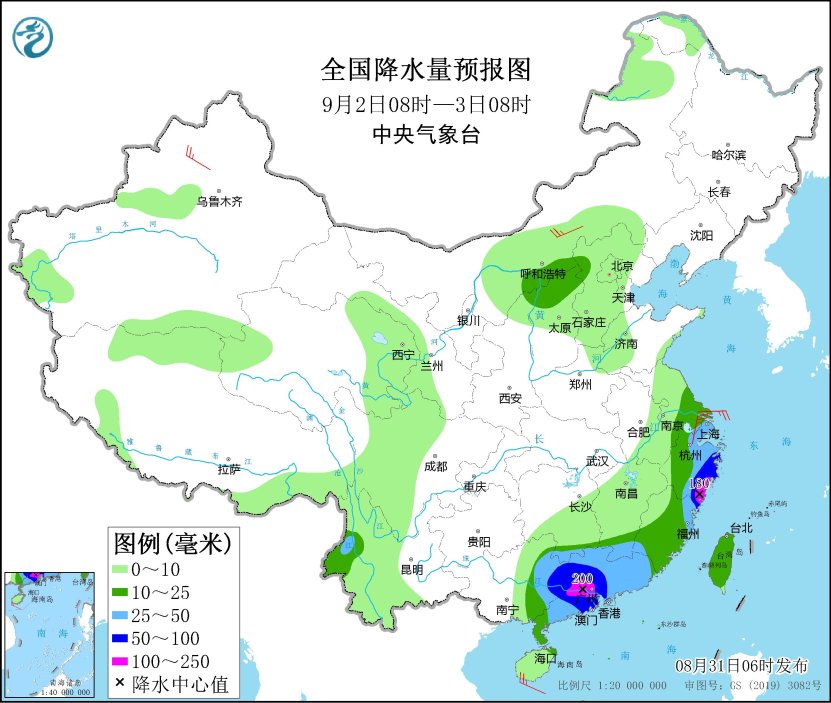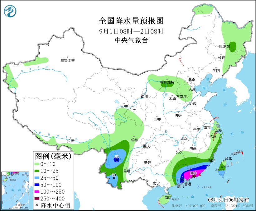 圖2 全國降水量預(yù)報(bào)圖(8月31日08時(shí)-9月1日08時(shí)) 來源:中央氣象臺網(wǎng)站