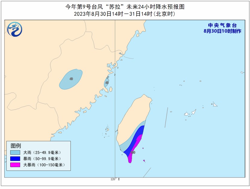降水預(yù)報:8月30日14時至31日14時,福建中東部、臺灣島東部和南部的部分地區(qū)有大到暴雨,局地大暴雨(100-150毫米)。