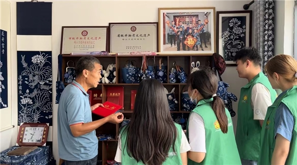 圖為藍(lán)印花布非遺傳承人向團(tuán)隊成員介紹非遺作品