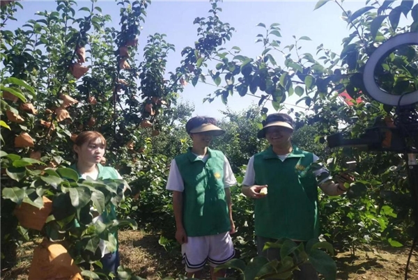 圖為團(tuán)隊成員在梨園現(xiàn)場直播