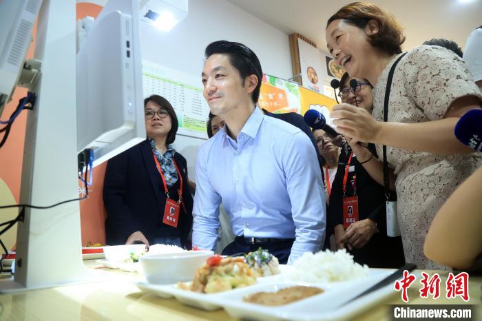 8月31日,臺(tái)北市市長蔣萬安在上海長者食堂體驗(yàn)人臉識(shí)別買單。中新社記者 湯彥俊 攝