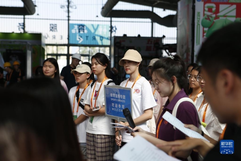 8月31日,在服貿(mào)會首鋼園區(qū)體育服務(wù)專題展區(qū)內(nèi),來自北京體育大學(xué)的服貿(mào)會志愿者在參加培訓(xùn)。