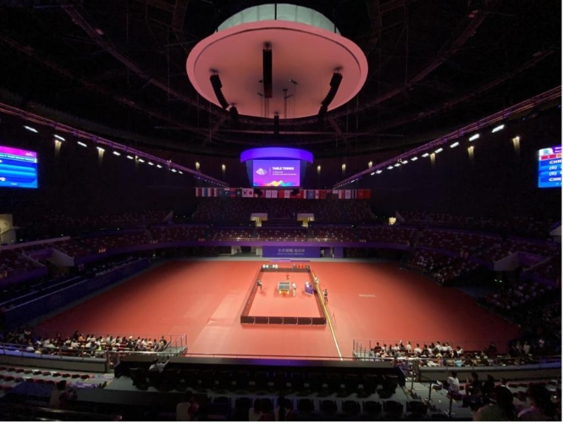 圖為杭州拱墅運(yùn)河體育公園體育館在進(jìn)行模擬“乒乓球女子團(tuán)體決賽”。新華社記者魏一駿攝