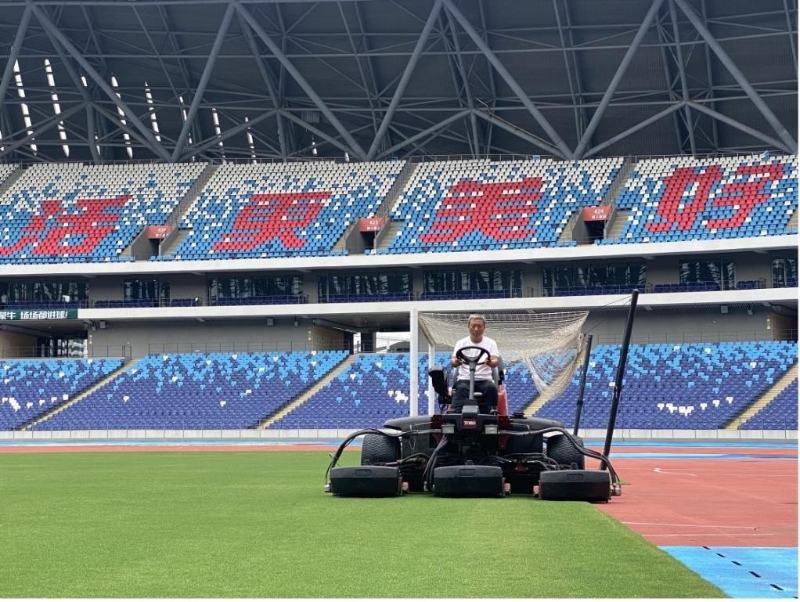 圖為工作人員在杭州亞運(yùn)會足球比賽場地之一溫州奧體中心體育場養(yǎng)護(hù)草坪。新華社記者魏一駿攝