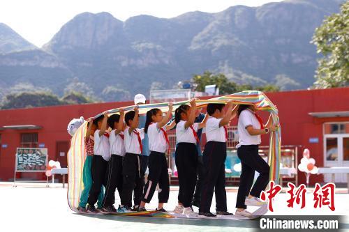 9月1日,北京275所受災(zāi)中小學(xué)和幼兒園如期開學(xué)。圖為學(xué)生在門頭溝區(qū)王平村中心小學(xué)操場做游戲?!≈行律缬浾?富田 攝