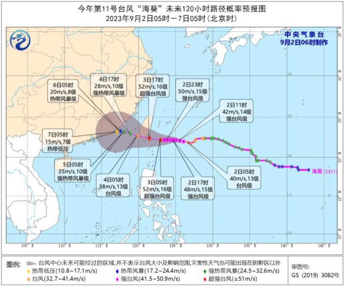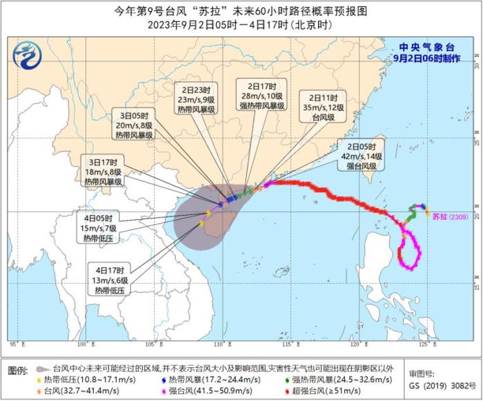 9月2日08時(shí)至3日08時(shí),受“蘇拉”影響,南海西北部、北部灣東部、瓊州海峽及廣東沿海、廣西南部沿海、珠江口以及香港和澳門等地將有7-9級(jí)、陣風(fēng)10-11級(jí)的大風(fēng),“蘇拉”中心經(jīng)過的附近海面或地區(qū)風(fēng)力有12-13級(jí)、陣風(fēng)14-15級(jí);受“??庇绊懀_(tái)灣海峽、浙江南部沿海、福建沿海、廣東東部沿海、臺(tái)灣島沿海將有6-7級(jí),陣風(fēng)8級(jí)大風(fēng),臺(tái)灣以東洋面部分海域風(fēng)力可達(dá)8-10級(jí),陣風(fēng)11-12級(jí),“??敝行慕?jīng)過的附近海面風(fēng)力可達(dá)12-13級(jí),陣風(fēng)14級(jí)。
