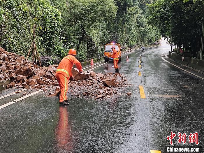 圖為9月1日上午,漳州市公路事業(yè)發(fā)展中心南靖分中心南坑公路站發(fā)現(xiàn)南靖縣南坑路段發(fā)生石溜方,落石占據(jù)半幅車道,工作人員正在開展清溜方作業(yè),確保公路安全暢通。南靖公路分中心供圖