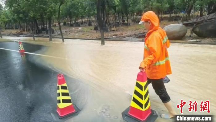 漳浦縣多地出現(xiàn)強降雨,嚴重影響道路通行。圖為1日公路站養(yǎng)護人員及時擺放安全警示標志,同時就近調(diào)用養(yǎng)護機械和人員開展路面積水、邊溝清理、疏通涵洞等工作。漳浦公路分中心 供圖