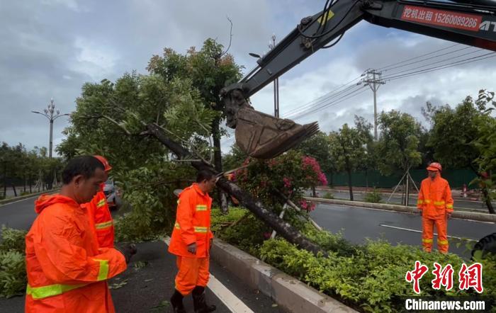 圖為1日東山縣環(huán)島路部分中央隔離帶內(nèi)路樹倒伏,東山公路分中心立即組織道路清障,扶正并加固倒伏路樹,確保道路交通安全。東山公路分中心 供圖