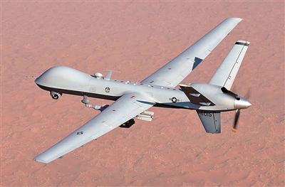 MQ-9A“死神”無人機機身長11米,翼展20米,采用倒“V”形尾翼布局,具備自主起降能力。機上配備一臺霍尼韋爾公司的TPE-331渦輪螺旋槳發(fā)動機,最大輸出功率900馬力。機身共有4個武器外掛點,可掛載4枚AGM-114“地獄火”導彈加2枚GBU-12“寶石路”激光制導炸彈或2枚GBU-38“聯(lián)合直接攻擊彈藥”。