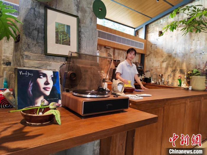 入秋,在武漢市蔡甸區(qū)索河街道梅池村的一幢民宿內(nèi),黑膠唱片機循環(huán)著復(fù)古樂調(diào),三兩個租客靜坐其中,手剝蓮蓬,賞曲品茗。