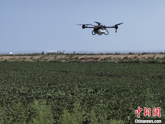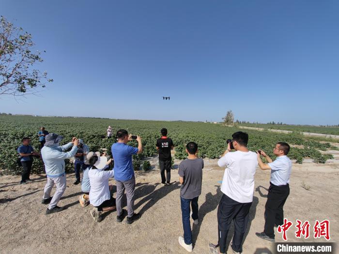 在新疆尉犁縣“超級(jí)棉田”,記者看到“90”后艾海鵬與團(tuán)隊(duì)成員用無(wú)人機(jī)對(duì)棉田進(jìn)行巡檢。