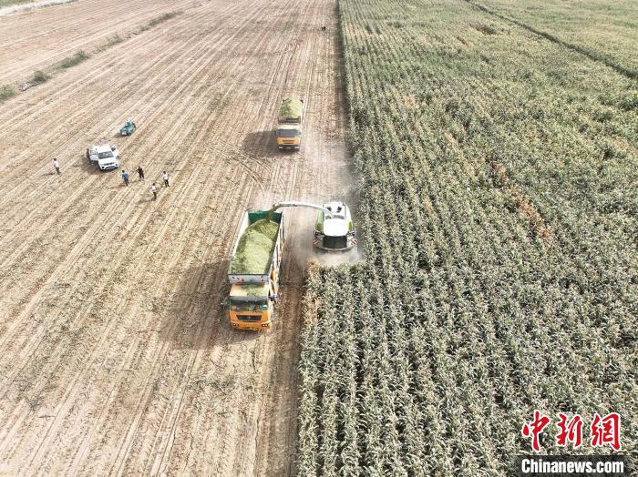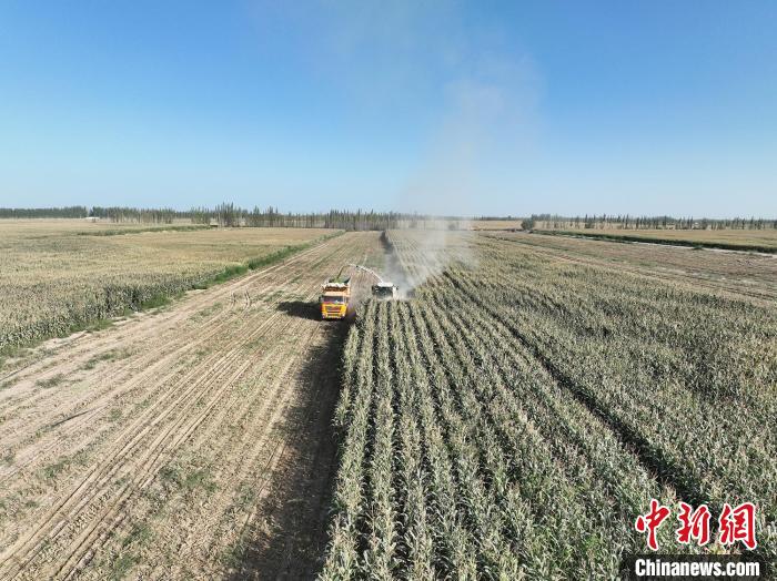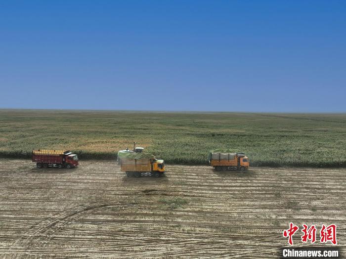 中新網(wǎng)烏魯木齊9月4日電 (戚亞平 陳陽(yáng)陽(yáng) 毛曉琴)眼下,新疆生產(chǎn)建設(shè)兵團(tuán)第十四師225團(tuán)4萬(wàn)畝青貯玉米陸續(xù)進(jìn)入成熟期。連日來(lái),225團(tuán)農(nóng)業(yè)發(fā)展服務(wù)中心、同心結(jié)農(nóng)業(yè)種植農(nóng)民專業(yè)合作社聯(lián)合社,積極組織人力、機(jī)械,開(kāi)展青貯玉米收割,田間地頭呈現(xiàn)出一片繁忙的豐收景象。