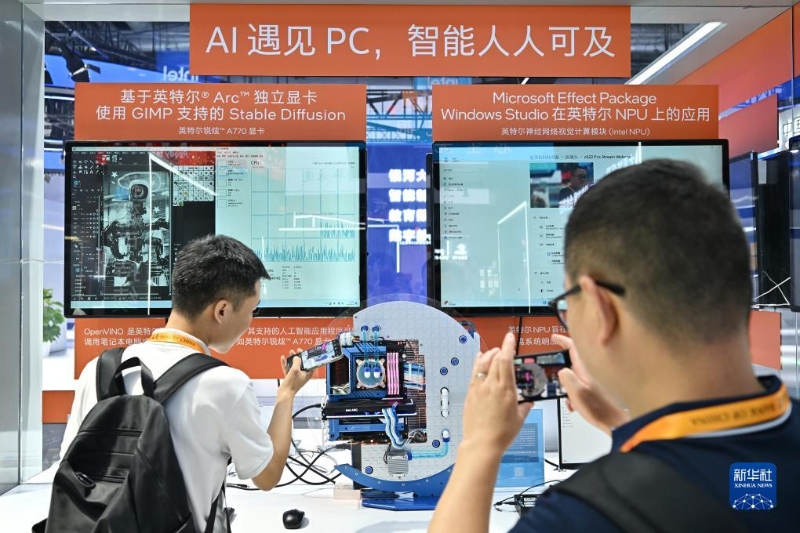 9月4日,兩名參觀者在服貿(mào)會國家會議中心的英特爾展臺拍攝一款獨(dú)立顯卡。