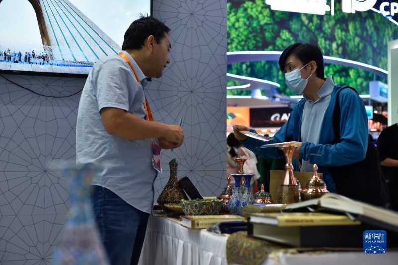 9月4日,在服貿(mào)會國家會議中心的伊朗展臺,觀眾在了解伊朗手工藝品。