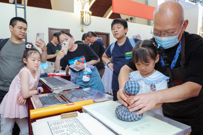 小朋友在上海書展現(xiàn)場(chǎng)體驗(yàn)活字印刷。