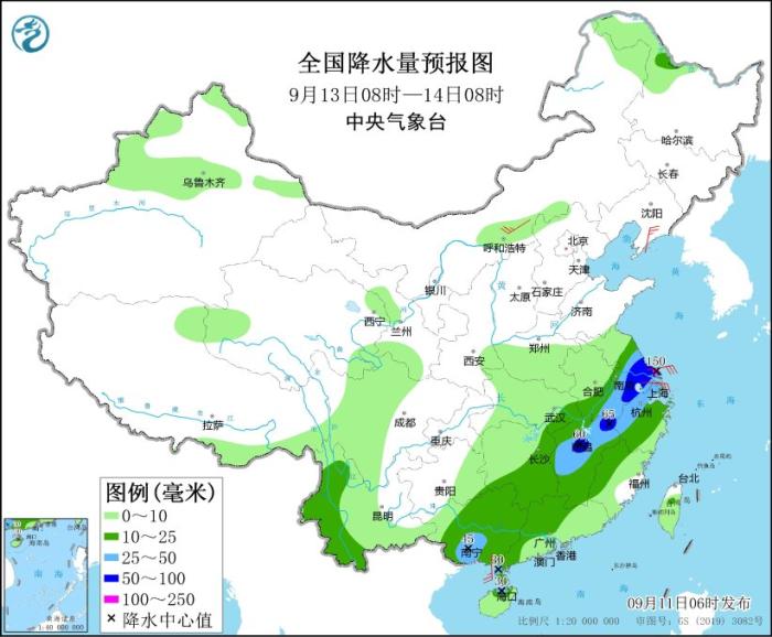 全國降水量預(yù)報(bào)圖(9月13日08時(shí)-14日08時(shí))