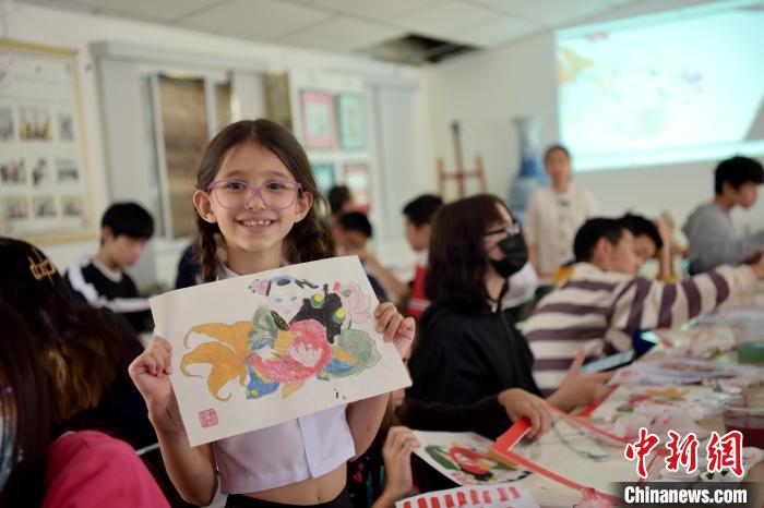 當(dāng)?shù)貢r間9月10日,天津楊柳青木版年畫博物館、巴西圣保羅華僑天主堂中文學(xué)校聯(lián)合舉辦年畫傳承研習(xí)活動。圖為一位巴西小學(xué)生展示她的年畫涂色作品。中新社記者 林春茵 攝