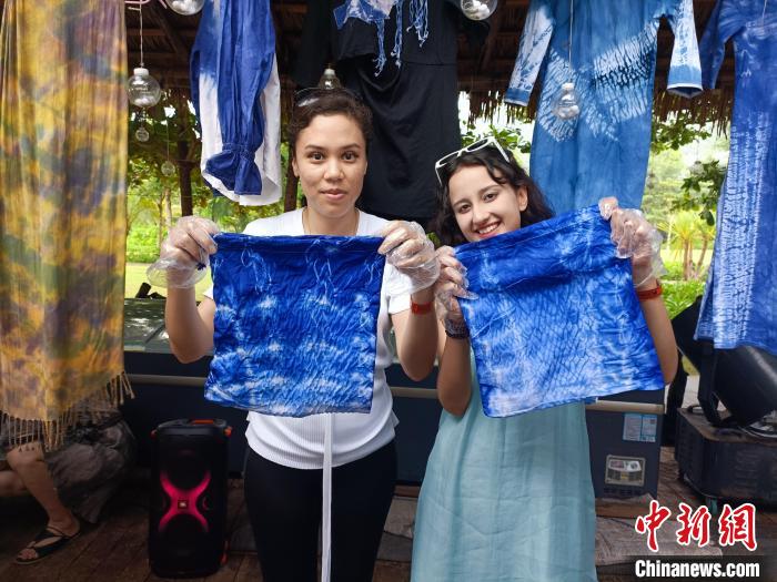 9月10日,2023年“在世界行走,為三亞停留”國際青年交流活動走進三亞天涯海角游覽區(qū),國際青年展示親手制作的扎染布袋。張月和 攝