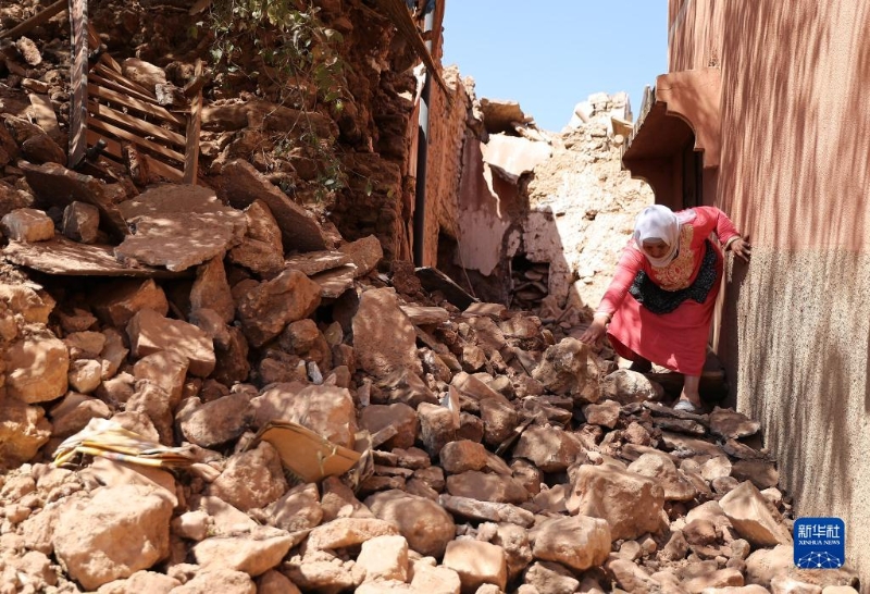 9月11日,在摩洛哥馬拉喀什南部的穆萊村,一名婦女走過地震廢墟。
