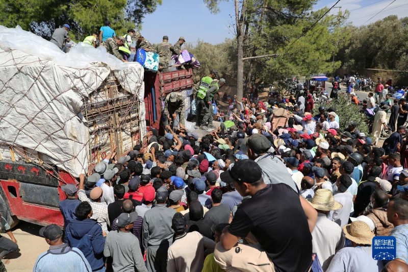 9月11日,救援人員在摩洛哥馬拉喀什南部的艾米茲米茲村分發(fā)救災(zāi)物資。