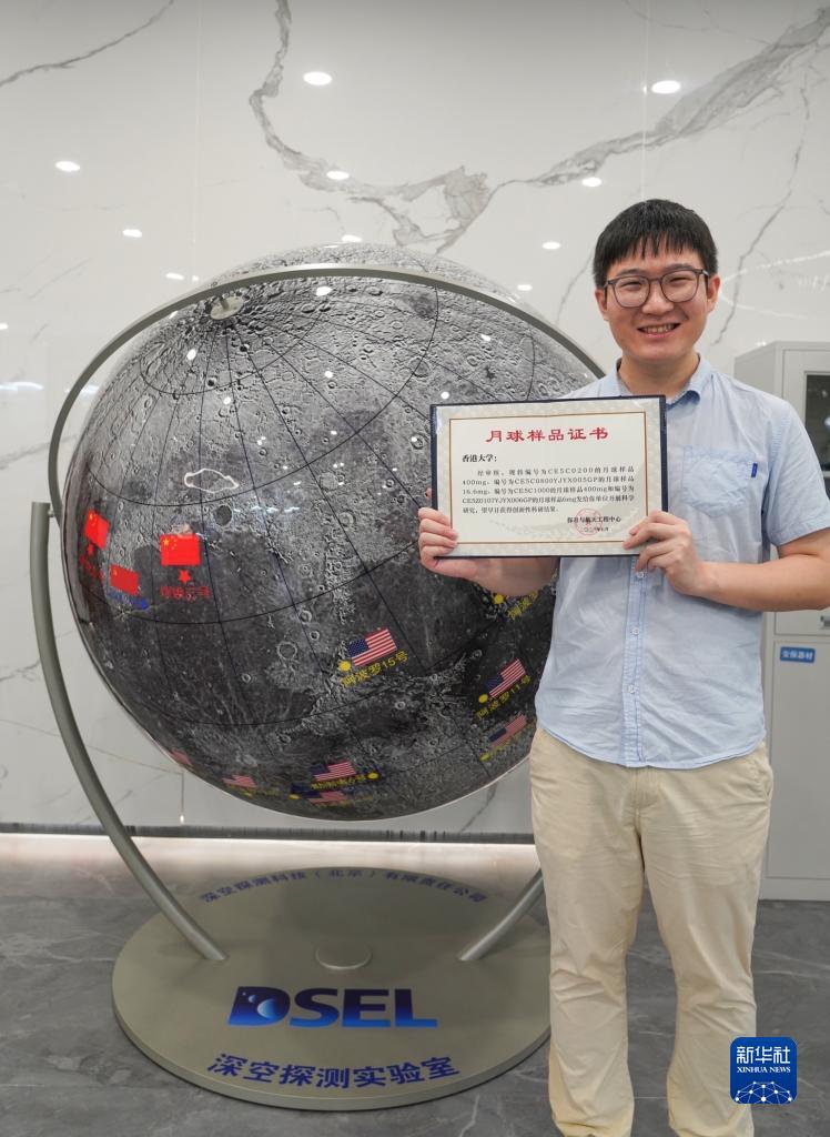 香港大學(xué)地球科學(xué)系博士后研究員錢煜奇到北京領(lǐng)取月球樣品后手拿證書(shū)拍照(7月31日攝)。新華社發(fā)