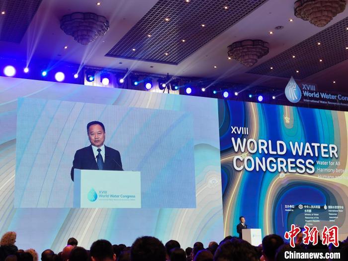 9月11日,中國水利部部長李國英在北京出席第18屆世界水資源大會開幕式并作主旨報告?!≈行律缬浾?陳溯 攝