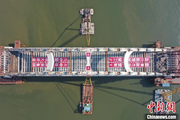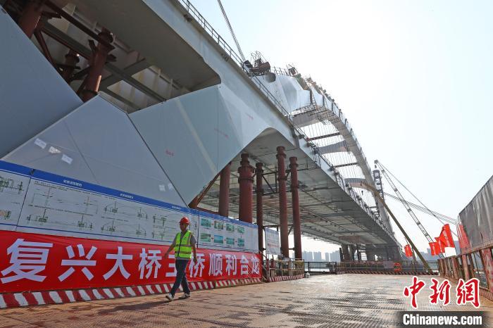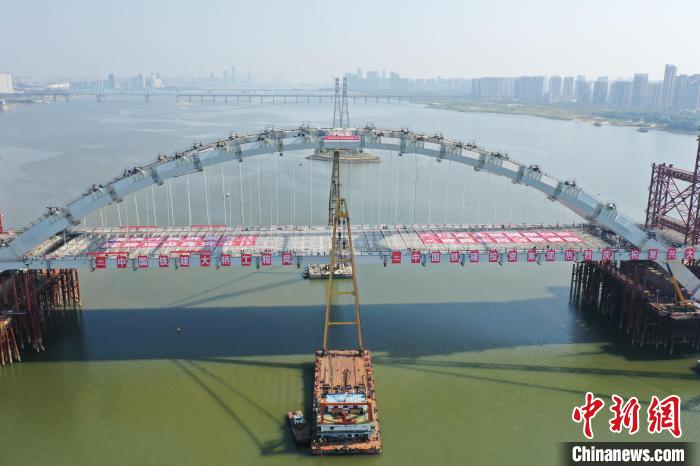 中新社南昌9月11日電(記者 劉占昆)橫跨“江西最大河流”贛江的南昌市第八座跨贛江橋梁——南昌復(fù)興大橋主橋11日合龍。南昌復(fù)興大橋是江西省最大跨度的鋼混組合梁鋼箱拱橋,也是中國境內(nèi)疊合板組合梁橋面最寬的拱橋。