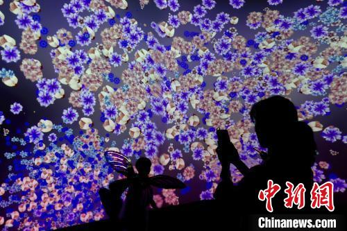 圖為家長帶著小朋友在北京瞭倉數(shù)字藏品博物館參觀“流動萬象”沉浸式光影展。 記者 易海菲 攝