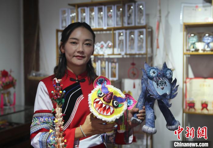 圖為張四代展示其白族布扎作品瓦貓?!↑S興鴻 攝