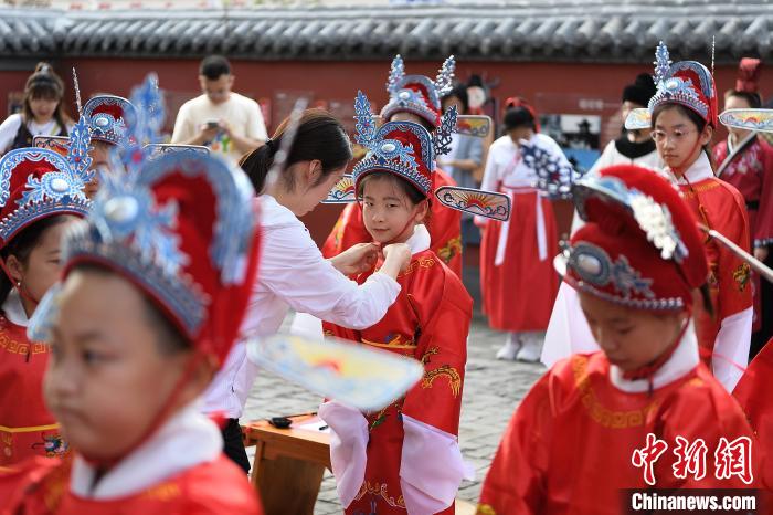 中新網(wǎng)太原9月12日電(高雨晴 胡健)正衣冠、啟蒙描紅、朱砂啟智……一場(chǎng)富有中華傳統(tǒng)文化特色的“開(kāi)筆禮”12日在山西太原唱經(jīng)樓內(nèi)舉行,數(shù)十名小學(xué)生身著狀元服,“沉浸式”體驗(yàn)古代學(xué)子的“開(kāi)學(xué)典禮”。