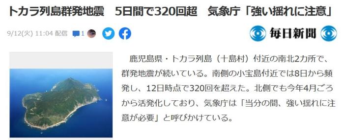 9月8日至12日,日本鹿兒島縣吐噶喇群島持續(xù)發(fā)生地震,5天內(nèi)地震超320次。圖片來(lái)源:日本《每日新聞》報(bào)道截圖