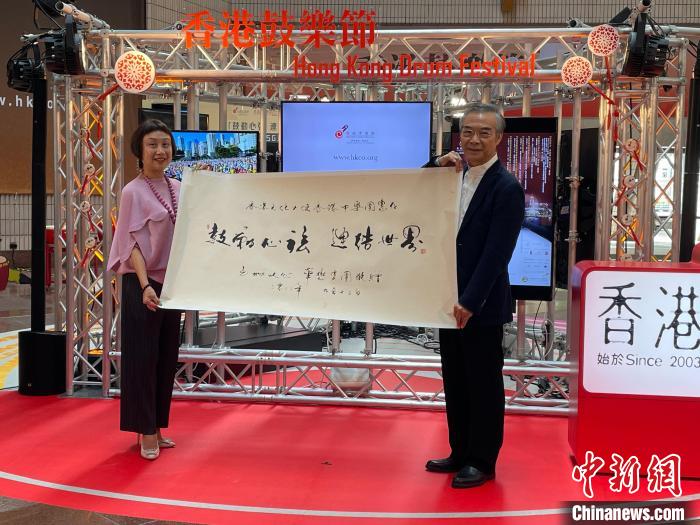 香港鼓樂節(jié)20周年活動贊助商華懋集團企業(yè)體驗總裁鐘慧敏(左)向閻惠昌(右)贈送紀念品。中新網(wǎng)記者 曾平 攝