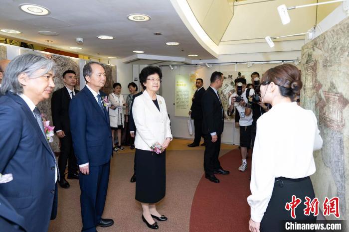 嘉賓們于9月13日在澳門城市大學(xué)參觀“盛世壁藏——唐代壁畫文化特展”。中國宋慶齡基金會(huì)供圖