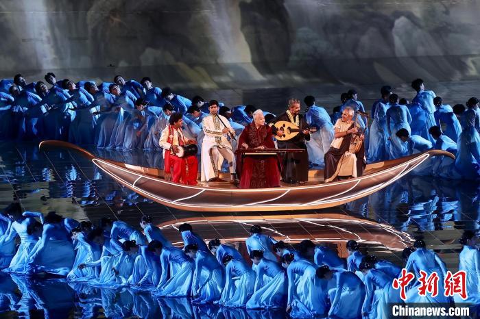 節(jié)目《同舟》利用首鋼大跳臺的舞臺格局,營造出文明之河的壯觀景象,來自中國、希臘、埃及、伊拉克、印度的演奏家們,同乘一葉小舟,用誕生自中國先秦時期的古琴、古希臘時期的里拉琴,古埃及時期的奈伊笛、古巴比倫時期的烏德琴、古印度時期的木丹加鼓,奏響了人類文明的和諧之音。當來自不同文明的古老樂器,共同演奏出《高山流水》《茉莉花》等經(jīng)典旋律時,文明的旋律迸發(fā)出震撼心靈的共振。