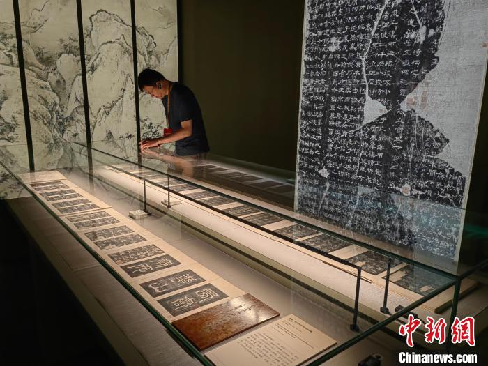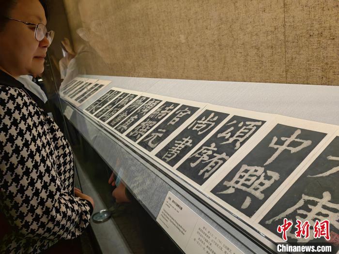 9月15日,故宮博物院與香港中文大學(xué)聯(lián)合推出的“宋拓魅力——碑帖珍本特展”在北京開幕。圖為觀眾在欣賞顏真卿書《唐中興頌?zāi)ρ聝浴匪瓮乇?。中新社記? 應(yīng)妮 攝