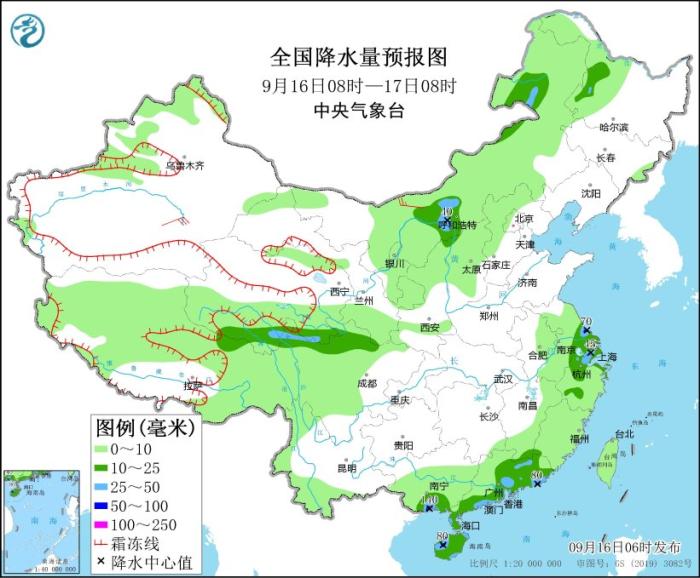 9月16日08時(shí)至17日08時(shí),內(nèi)蒙古西部和東北部、黑龍江西部、青海南部、陜西北部、江淮東部、江南北部、川西高原北部、華南中南部等地部分地區(qū)有中到大雨,其中,江蘇中部、廣西西南部和東南部沿海、廣東東南部沿海、海南島西北部等地部分地區(qū)有暴雨或大暴雨(100~140毫米)。內(nèi)蒙古中西部、新疆南疆盆地等地部分地區(qū)有4~6級(jí)風(fēng)。