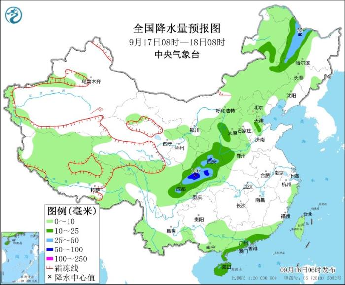 9月17日08時(shí)至18日08時(shí),內(nèi)蒙古東北部、東北地區(qū)西部、西北地區(qū)東南部、西南地區(qū)東北部、華南南部和海南島等地部分地區(qū)有中到大雨,其中,黑龍江西北部、陜西中南部、四川盆地北部等地部分地區(qū)有暴雨或大暴雨(100~120毫米)。內(nèi)蒙古中部、新疆南疆盆地等地部分地區(qū)有4~6級(jí)風(fēng)。