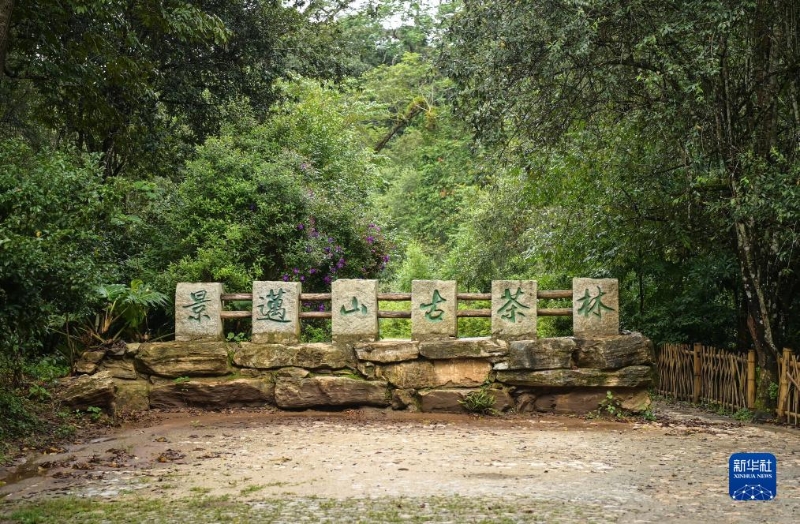 在景邁大寨古茶林入口處矗立有“景邁山古茶林”字樣的標識(8月29日攝)。新華社記者 李賀 攝