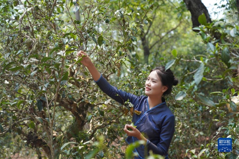 4月19日,當(dāng)?shù)卮迕裨诰斑~大寨古茶林采摘春茶。新華社發(fā)(盧磊 攝)