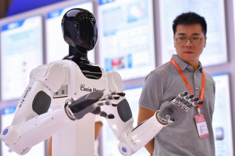 9月15日,參觀者在2023世界計(jì)算大會(huì)專題展上參觀服務(wù)機(jī)器人。新華社記者 陳澤國 攝