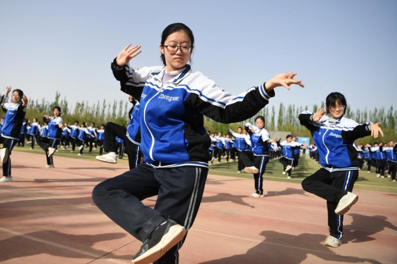 敦煌中學(xué)的學(xué)生在操場(chǎng)上做敦煌舞課間操(4月26日攝)。新華社記者 陳斌 攝