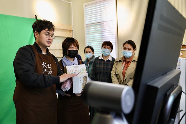 2022年5月,在福建省福州市永泰縣長(zhǎng)慶鎮(zhèn)農(nóng)技站直播室,臺(tái)灣青年詹竣杰(左)在向長(zhǎng)慶鎮(zhèn)干部及青年演示直播帶貨。(圖/新華社)