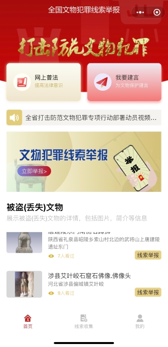 該平臺(tái)是基于微信13億活躍用戶(hù)的龐大群體而打造的小程序,廣大群眾和網(wǎng)友無(wú)需下載APP軟件,即可進(jìn)行涉及文物犯罪線索舉報(bào)。相關(guān)信息也可以第一時(shí)間流轉(zhuǎn)至各省、市、縣公安機(jī)關(guān)和文物部門(mén),便于及時(shí)開(kāi)展工作。
